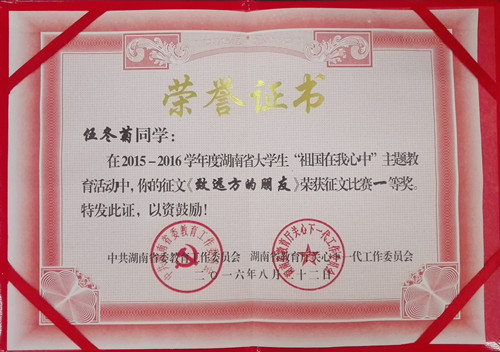 2016年12月12日,2015—2016学年度湖南省大学生“祖国在我心中”主题教育活动落下帷幕,管理系2015级旅游管理班伍冬菊、2015级酒店管理1班龙艳兰荣获一、二等奖。