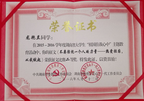 2016年12月12日,2015—2016学年度湖南省大学生“祖国在我心中”主题教育活动落下帷幕,管理系2015级旅游管理班伍冬菊、2015级酒店管理1班龙艳兰荣获一、二等奖。