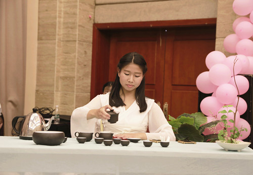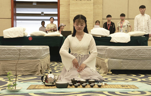 比赛期间,为活跃现场气氛,展示酒店管理专业特色,来自2015级酒店管理专业的刘敏、杨阳两位同学为大家展示了茶艺,优雅的姿态将茶艺中的十八道工序展示得淋漓尽致。