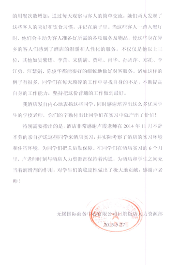 无锡日航酒店表扬信